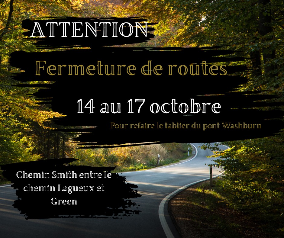 Fermeture de routes 2025-10-14 (2025-10-14) par Éditeur Stanstead-Est FERMETURE DE ROUTES Attention! Le chemin Smith entre le chemin Lagueux et Green sera fermé du 14 au 17 octobre afin de permettre de refaire le tablier du pont Washburn. Merci de votre compréhension!