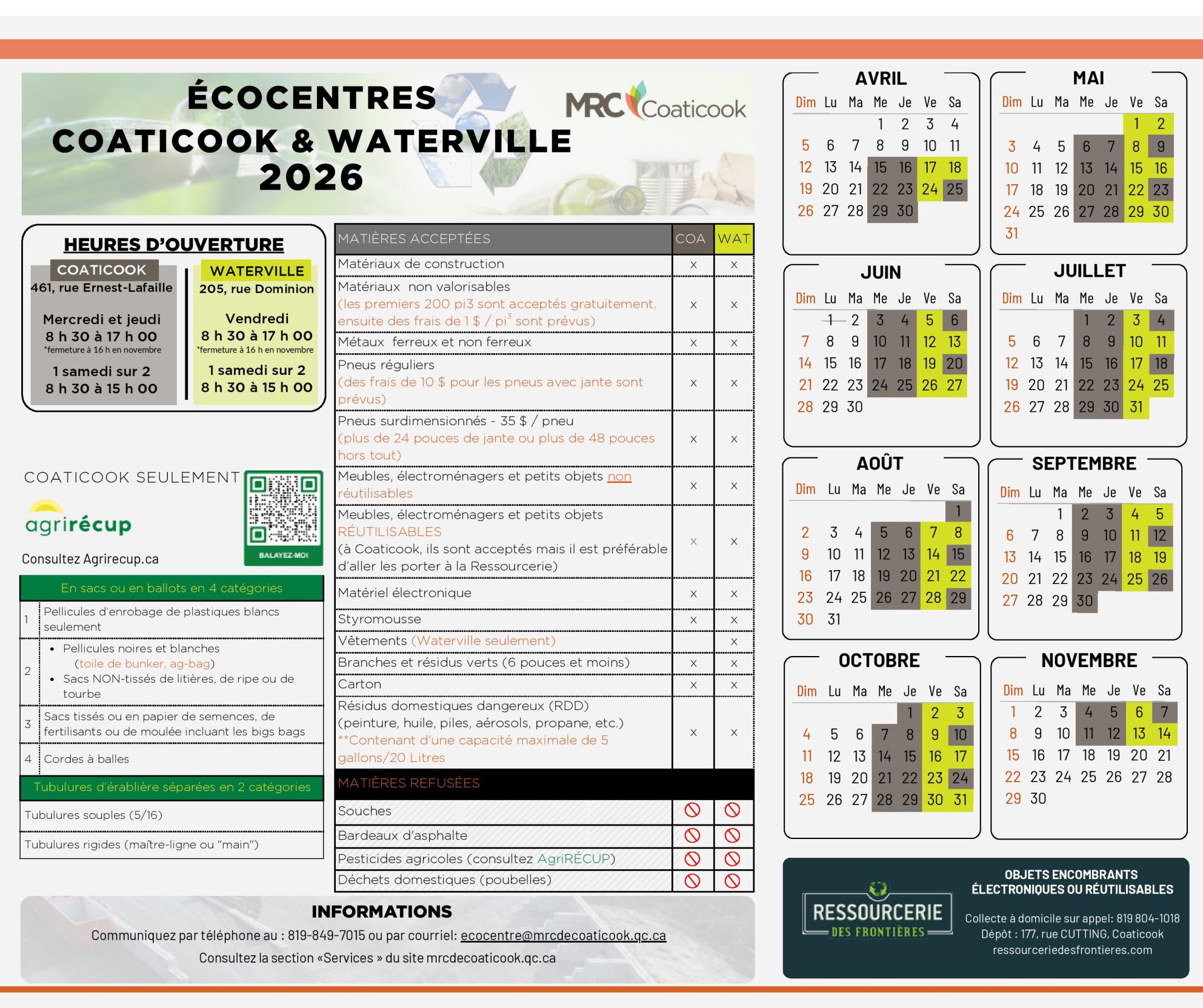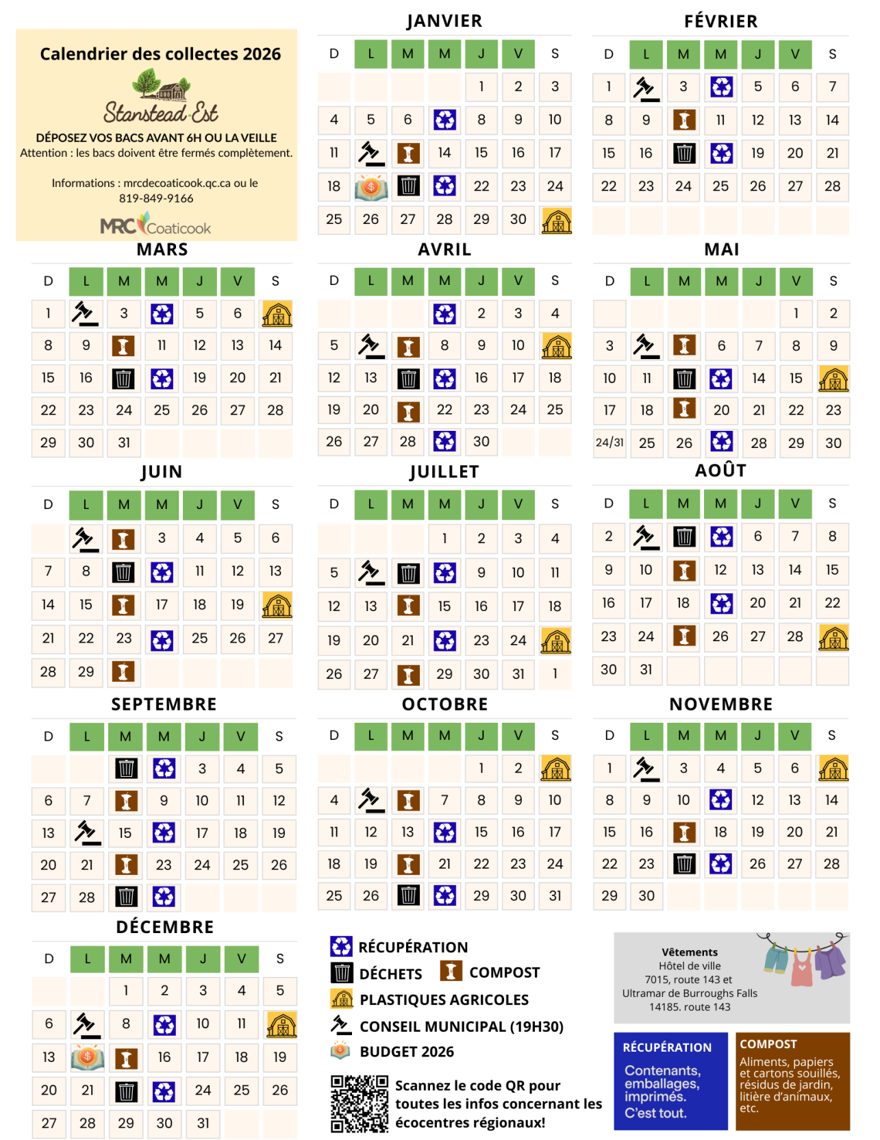 Matières Résiduelles La gestion des matières résiduelles est gérée par la MRC de Coaticook, en collaboration avec la Municipalité de Stanstead-Est afin de favoriser la protection de l’environnement et l’embellissement du territoire, en accord avec ses règlements. Télécharger le calendrier des collectes en PDF : CALENDRIER DES COLLECTES 2026 CALENDRIER DES COLLECTES 2025 QUI CONTACTEREN CAS DE PROBLÈMES ? En cas de problème relativement au service des matières résiduelles, les citoyens doivent contacter la MRC de Coaticook, qui est responsable de la gestion du fournisseur : MRC de Coaticook294, rue St-Jacques NordCoaticook (Québec)J1A 2R3 Téléphone: 819 849-9166Télécopieur: 819 849-4320 Courriel: info@mrcdecoaticook.qc.ca